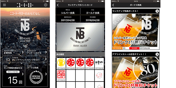 スタンプを貯めるごとにランクアップするポイントカードの他に、イベントやキャンペーン情報、店舗の検索などが可能なのでおすすめです( `ー´)ノ