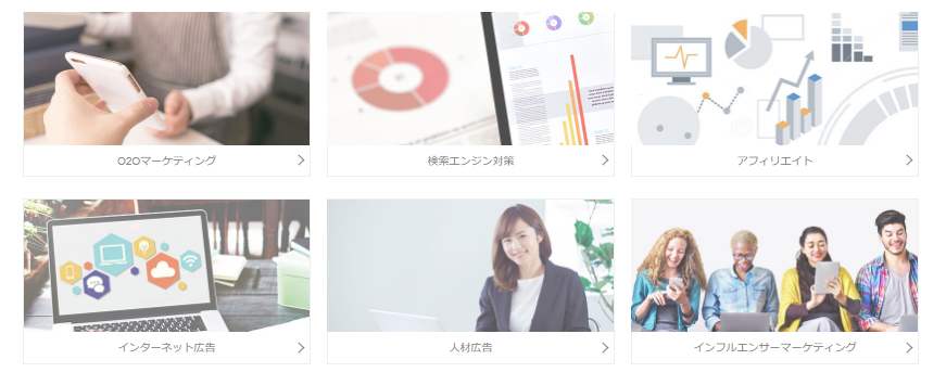 「SERVICE」では、事業領域を「O2O」「検索エンジン対策(SEO)」「アフィリエイト」「インターネット広告」「人材広告」「インフルエンサー・マーケティング」に分けています。