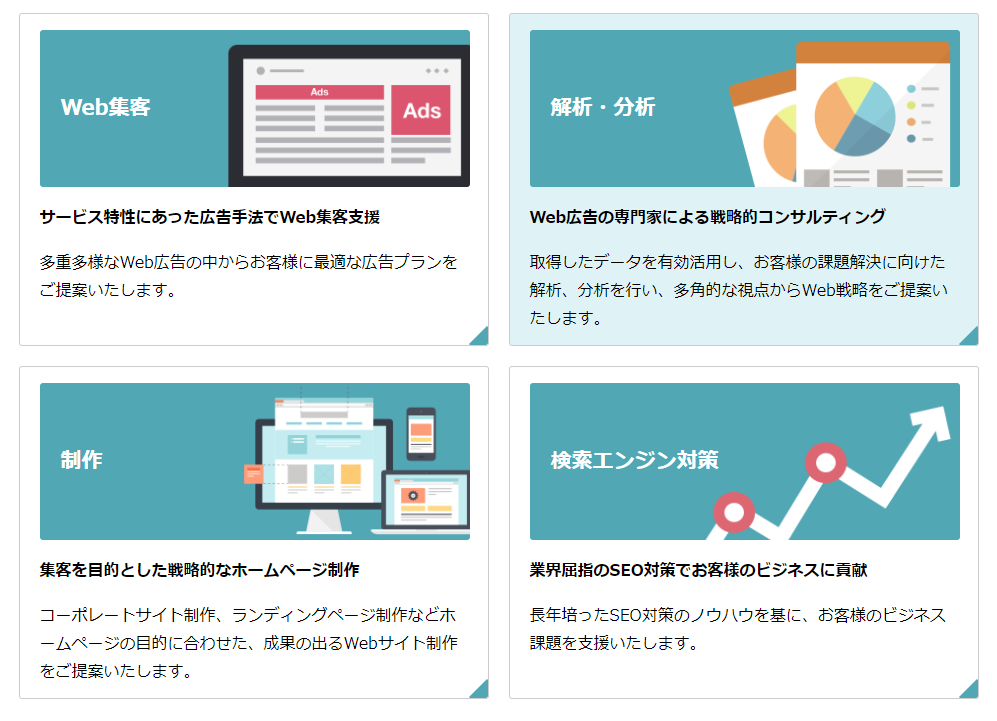 より見やすく分かりやすく情報を伝えられるようにソリューション別にカテゴリ分けを行っており、カテゴリは、「WEB集客」「解説・分析」「検索エンジン対策」となっております。