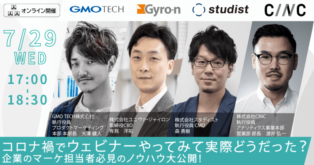7月29日(水)、GMO TECH株式会社は、株式会社スタディスト、株式会社CINC、株式会社ユニヴァ・ジャイロンの3社と共同で、無料Webセミナー『【トークセッション】コロナ禍でウェビナーやってみてどうだった? 企業のマーケ担当必見のノウハウ大公開』を開催いたします!