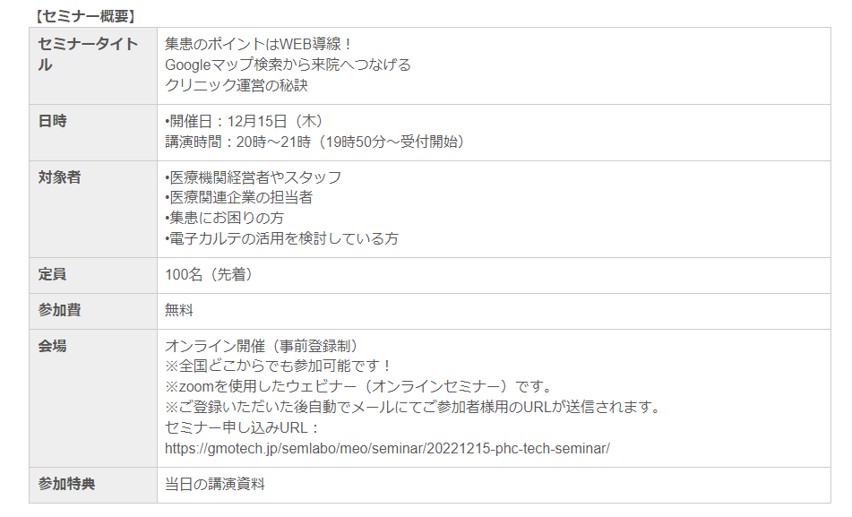 弊社が提供するMEO(※1)総合管理ツール『MEO Dashboard byGMO』に関連して、クラウド電子カルテ「きりんカルテ」を提供するPHC株式会社(以下、PHC)と共催セミナーを行います。