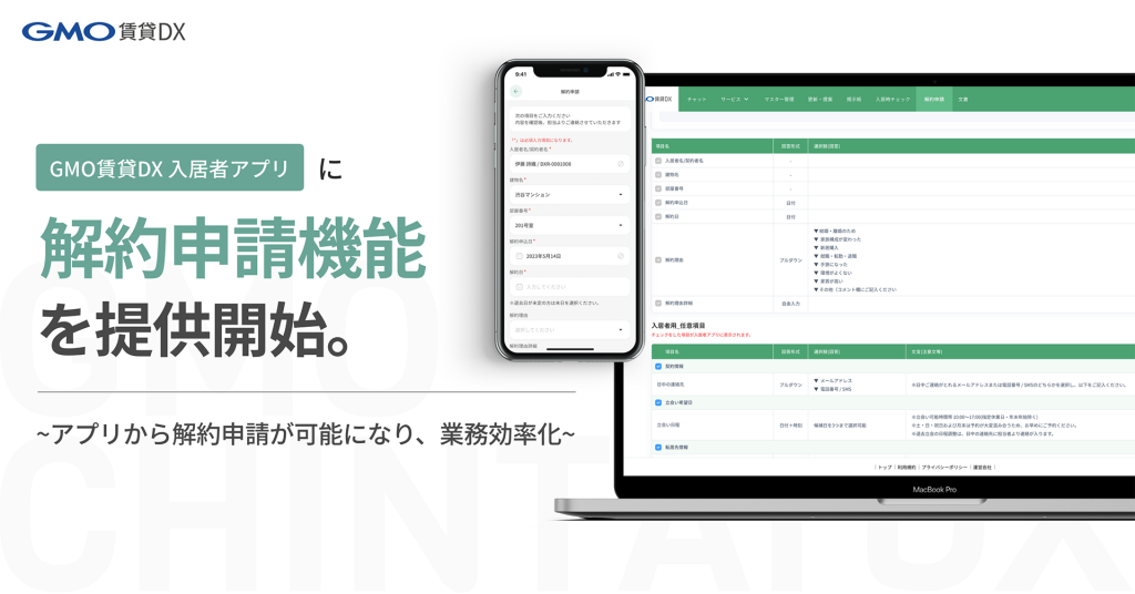 弊社の連結会社で、不動産賃貸領域におけるDX(デジタルトランスフォーメーション)を支援するGMO ReTech株式会社は、7月26日(水)より、賃貸管理会社向けプラットフォーム「GMO賃貸DX 入居者アプリ」にアプリから解約の手続きをすることができる『解約申請機能』を提供開始したことをお知らせいたします。