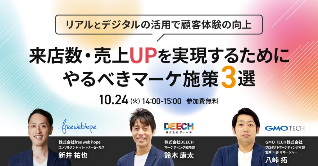 GMOインターネットグループでインターネット上の集客サービスを展開するGMO TECH株式会社は、LP制作・LPOサービスを提供する株式会社free web hopeと、エリアマーケティングシステムを提供する株式会社DEECHと共催し、10月24日(火)14時より、「リアルとデジタルの活用で顧客体験の向上 来店数・売上UPを実現するためにやるべきマーケ施策3選」と題したウェビナーを開催いたします!