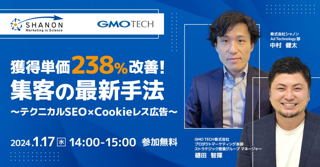 アドテクノロジーやマーケティングクラウド事業を提供する株式会社シャノンと共催し、1月17日(水)14時より、「テクニカルSEOとCookieレス広告で顧客を獲得 残り1年と迫ったCookie規制を見据えた今後の戦略」と題したウェビナーを開催いたします。