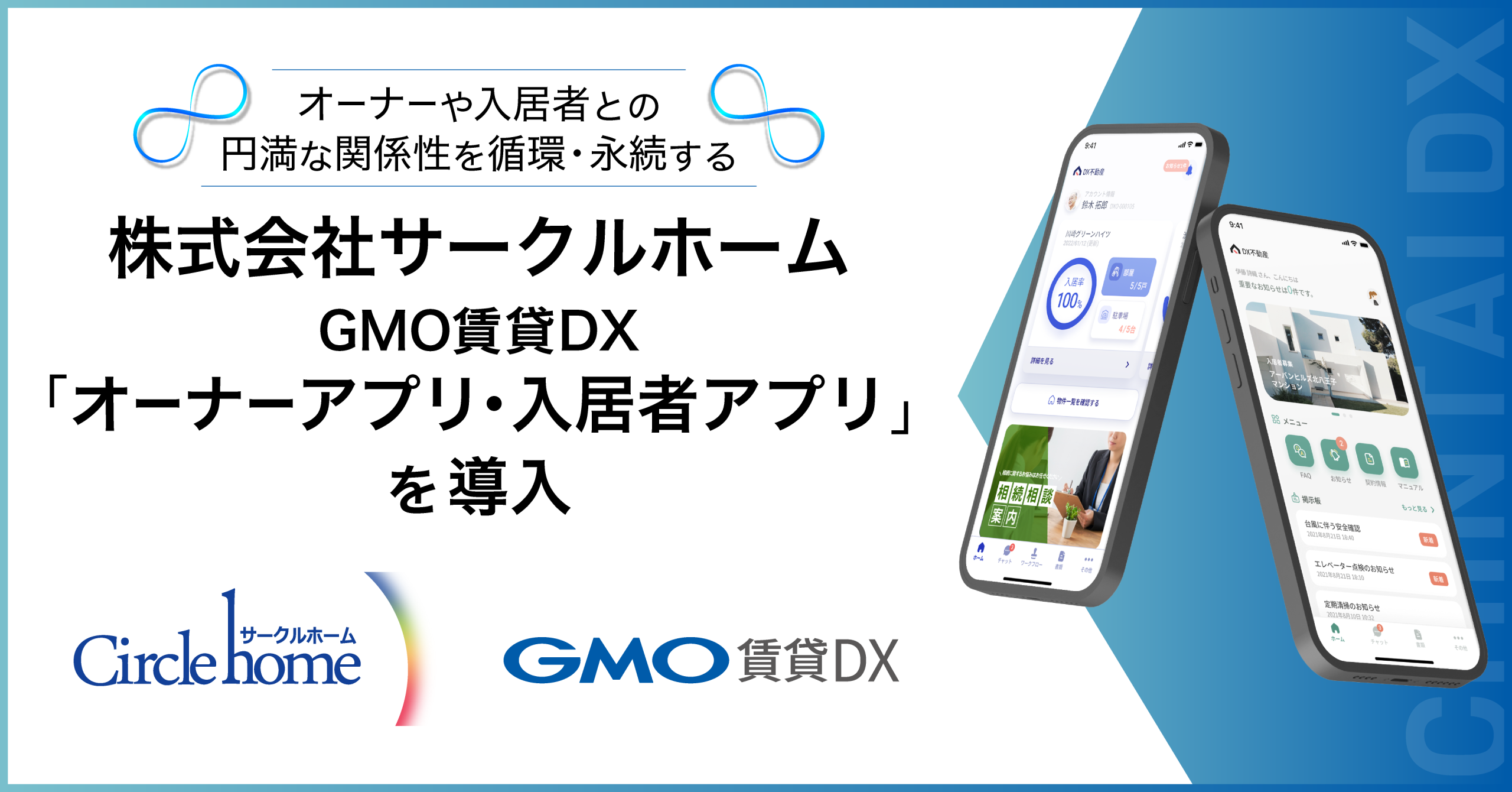 弊社の連結会社で、不動産賃貸領域におけるDX(デジタルトランスフォーメーション)を支援するGMO ReTech株式会社(代表取締役社長:鈴木 明人)は、賃貸管理会社向けプラットフォーム「GMO賃貸DX オーナーアプリ」と「GMO賃貸DX 入居者アプリ」の両アプリを、株式会社サークルホームに導入いただいたことをお知らせいたします。