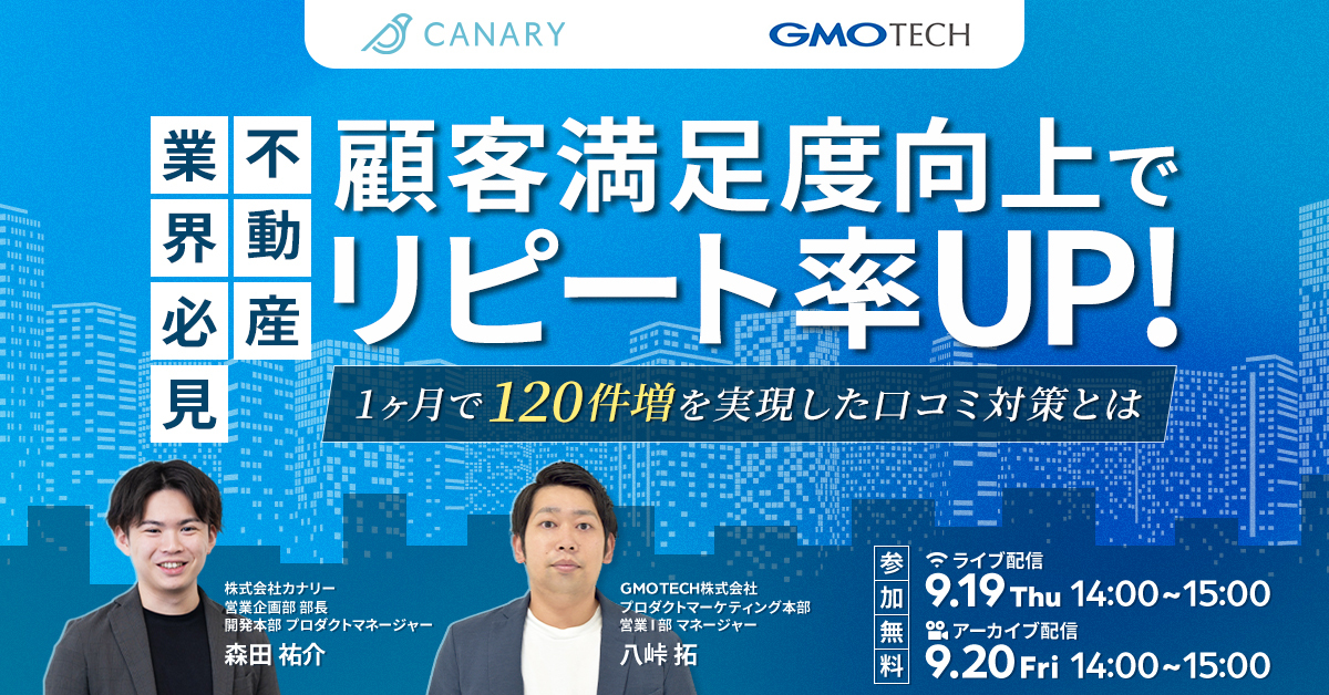 GMOインターネットグループでインターネット上の集客サービスを展開するGMO TECH株式会社(代表取締役社長CEO:鈴木 明人)は、部屋探しプラットフォーム「CANARY(カナリー)」、不動産仲介会社向け顧客管理システム「CANARY Cloud(カナリークラウド)」を提供する株式会社カナリーと共催し、9月19日(木)14時、20日(金)14時より、「不動産業界必見!顧客満足度向上でリピート率UP 1ヶ月で120件増を実現した口コミ対策とは?」と題したウェビナーを開催いたします。