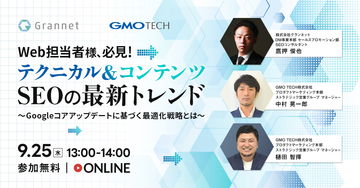 GMOインターネットグループでインターネット上の集客サービスを展開するGMO TECH株式会社(代表取締役社長CEO:鈴木 明人)は、コンテンツSEOサービスを提供する株式会社グランネットと共催し、9月25日(水)13時より、「【Web担当者様必見】Googleコアアップデートに基づくテクニカル&コンテンツSEO戦略とは?」と題したウェビナーを開催いたします。