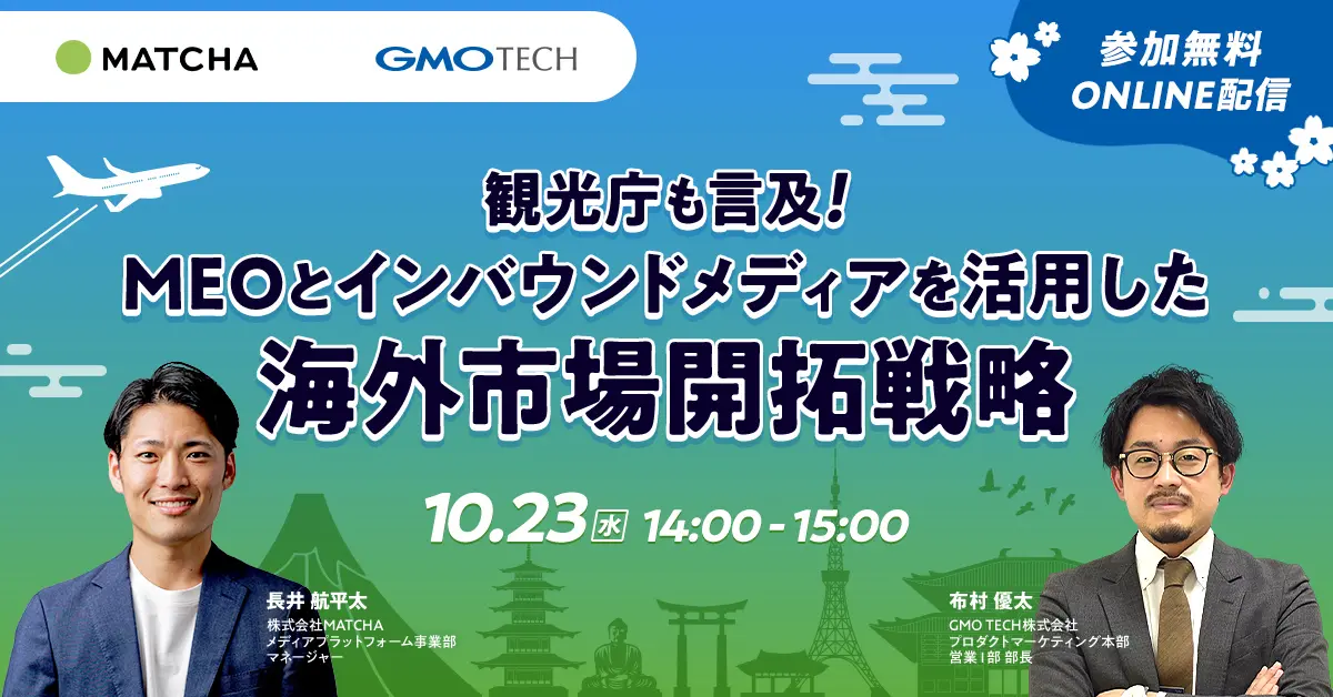GMOインターネットグループでインターネット上の集客サービスを展開するGMO TECH株式会社(代表取締役社長CEO:鈴木 明人)は、インバウンド対策や訪日外国人のマーケティング・集客支援を行っている株式会社株式会社MATCHAと共催し、10月23日(水)14時より、「今対策しなければ手遅れに!?インバウンド対策のトレンドと多角的な集客戦略」と題したウェビナーを開催いたします。