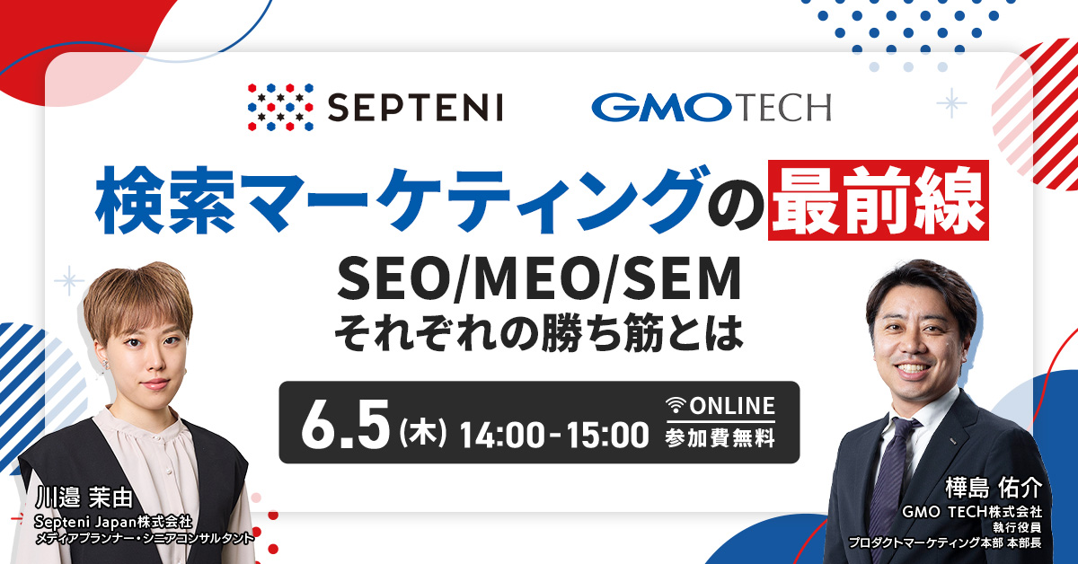 GMOインターネットグループでインターネット上の集客サービスを展開するGMO TECH株式会社(代表取締役社長CEO:鈴木 明人)は、 Septeni Japan株式会社と共催し、6月5日(木)14時より、「検索マーケティングの最前線 成果を分けるSEO・MEO・SEMの“正しい”戦い方」と題したウェビナーを開催いたします。