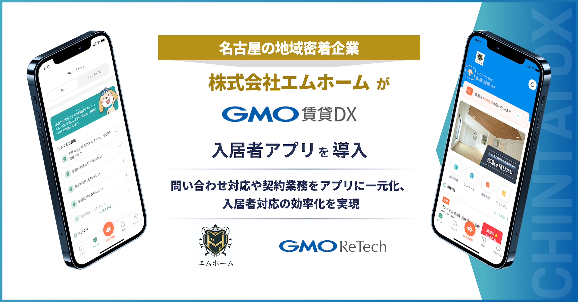 弊社の連結会社で、不動産賃貸領域におけるDX(デジタルトランスフォーメーション)を支援するGMO ReTech株式会社(代表取締役社長:鈴木 明人)は、不動産管理会社向けアプリ『GMO賃貸DX 入居者アプリ』を、株式会社エムホームに導入いただきました。本アプリは、2025年10月27日(月)に運用開始します。