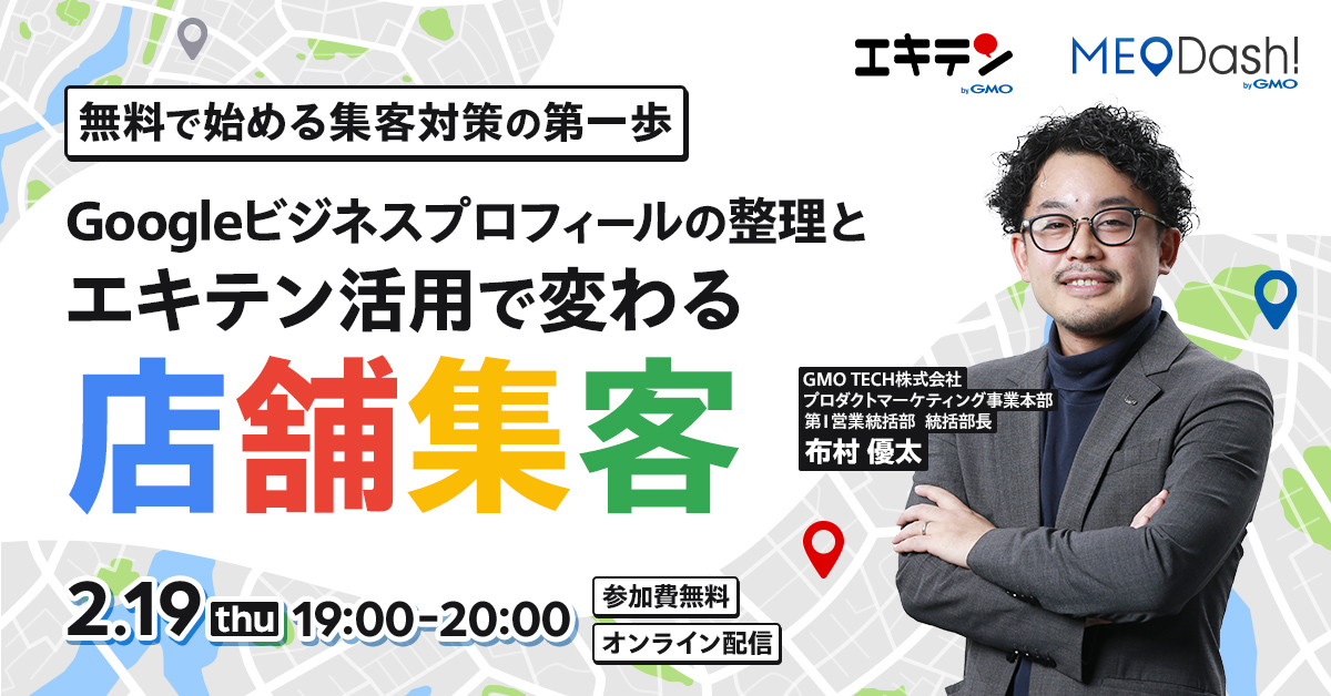 GMOインターネットグループのGMO TECH株式会社(代表取締役社長:鈴木 亮一)は、2026年2月19日(木)19:00より、GMOデザインワンとの共催ウェビナー「無料で始める集客対策の第一歩 ~Googleビジネスプロフィールの整理とエキテン活用で変わる店舗集客~」を開催します。