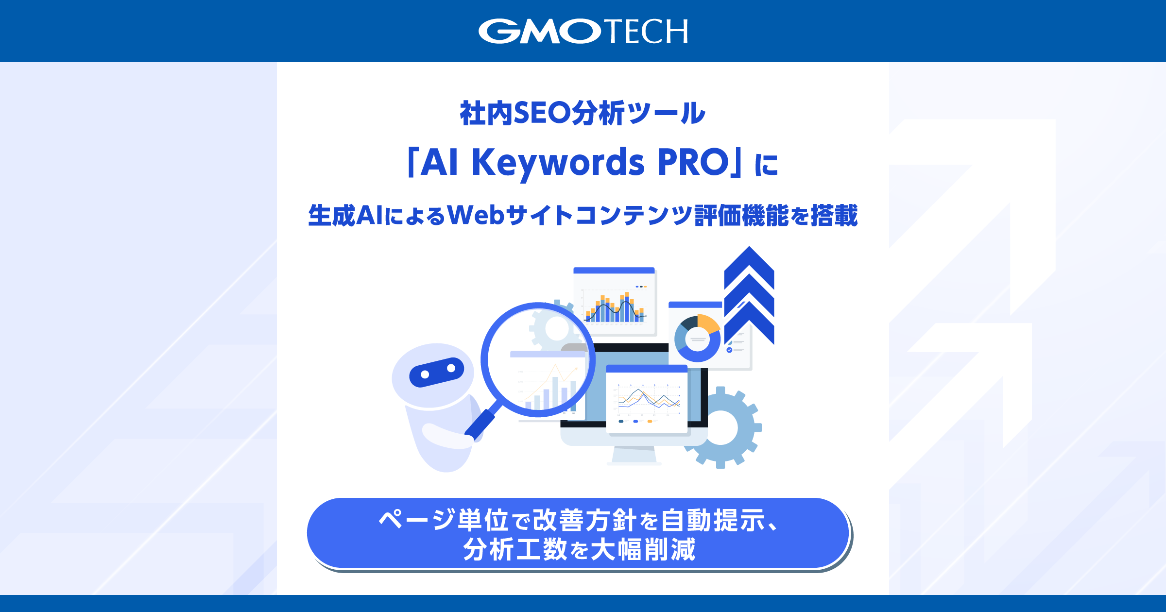 GMOインターネットグループのGMO TECH株式会社(代表取締役社長:鈴木 亮一)は、自社開発の社内向けSEO分析ツール「AI Keywords PRO」において、生成AIがWebサイト内のコンテンツを自動評価し、ページ単位で改善方針を提示する新機能を追加しました。本機能により、コンテンツとターゲットキーワードの関連性を定量的に分析し、改善対象ページを特定。分析精度の向上と作業時間の大幅削減を実現します。