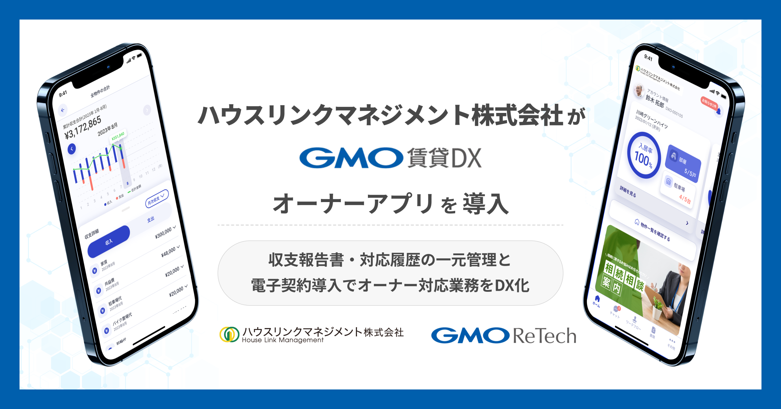 GMOインターネットグループのGMO ReTech株式会社(代表取締役社長:鈴木 明人)は、不動産管理会社向けアプリ『GMO賃貸DX オーナーアプリ』を、ハウスリンクマネジメント株式会社に導入しました。オーナー対応業務の一元管理による業務効率化と透明性向上を目的に、2026年5月11日(月)に運用を開始します。