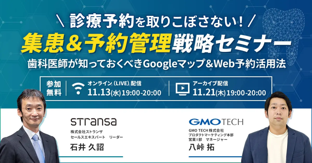 GMO TECHとストランザが共済し、歯科医院向けの集患&予約管理戦略ウェビナーを開催します!