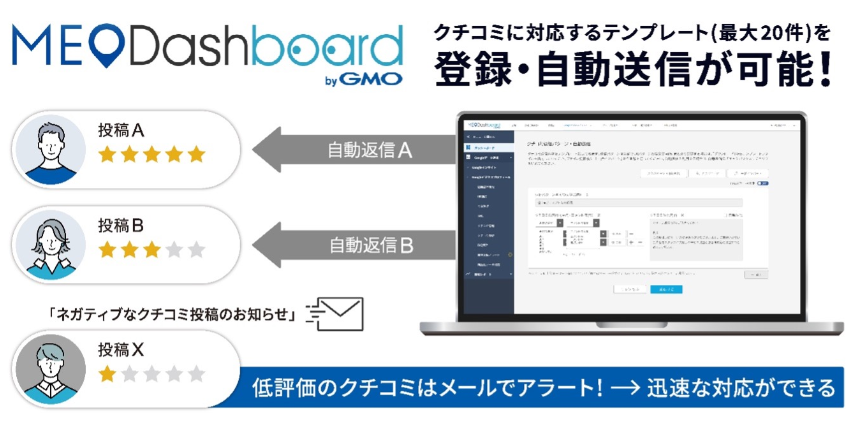 『MEO Dashboard byGMO』に Googleマップの『クチコミ自動返信機能』と 低評価の『ネガティブクチコミアラート機能』を追加