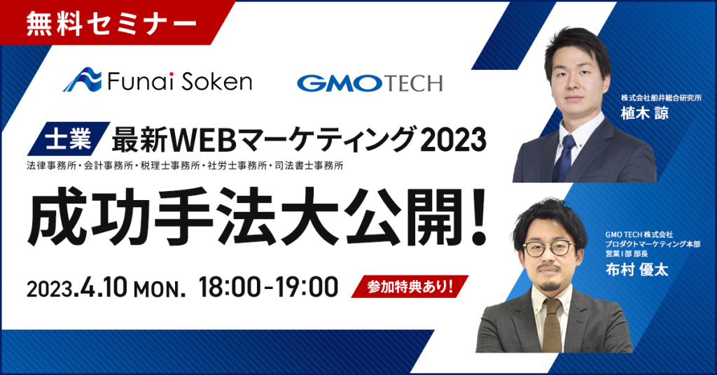 【無料ウェビナーのご案内】GMO TECHと船井総合研究所が 士業の方向けにWEBマーケティングの最新手法をご紹介する共催ウェビナーを開催!