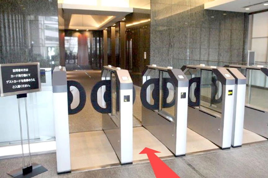 2.セキュリティーゲートを通って、エレベーターで受付のある11階まで上ってください。ゲストカードをかざすとセキュリティーゲートが開きます。