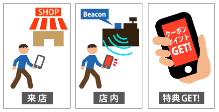 본 옵션 서비스는, 「Beacon」단말을 실점포에 제공해, 내점한 고객의 스마트폰에 인스톨 되고 있는 점포 어플리에의 쿠폰권이나 내점 스탬프의 자동 전달을 가능하게 하는 서비스입니다.