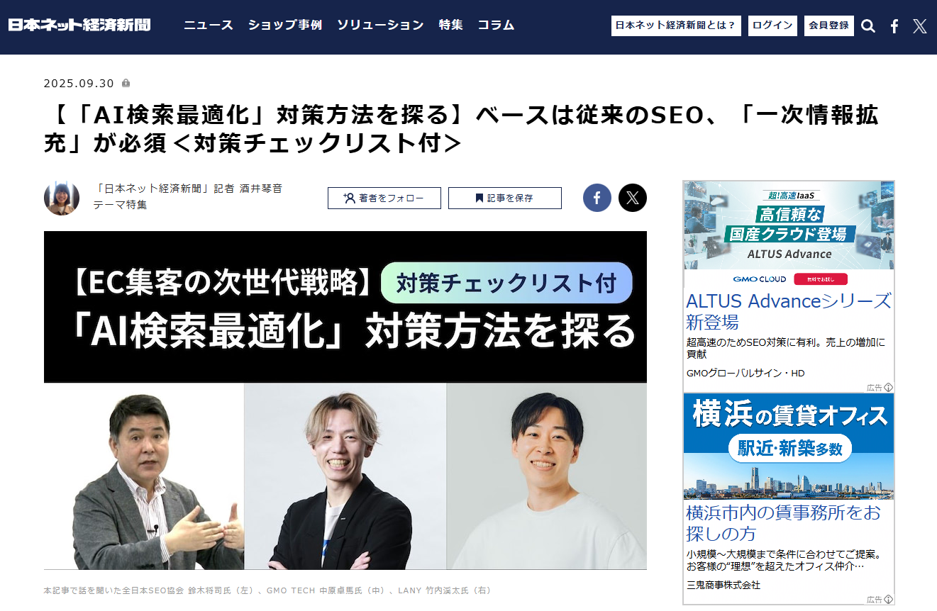 생성 AI의 보급에 의해 AI와의 대화를 통한 정보 수집이 일반화되고 있지만, 그 전제로서 「종래의 SEO 대책이 계속 중요하다」라는 점이 전문가의 공통적인 견해로서 나타났습니다. 기사에서는, 나카하라가 AIO/LLMO의 전문가로서, AI검색 시대에 있어서도 SEO를 기반으로 한 시책이 빼놓을 수 없는 것을 지적하는 것과 동시에, EC 사업자에게 퍼지는 새로운 기회와 임해야 할 구체적 전략에 대해 견해를 말하고 있습니다.