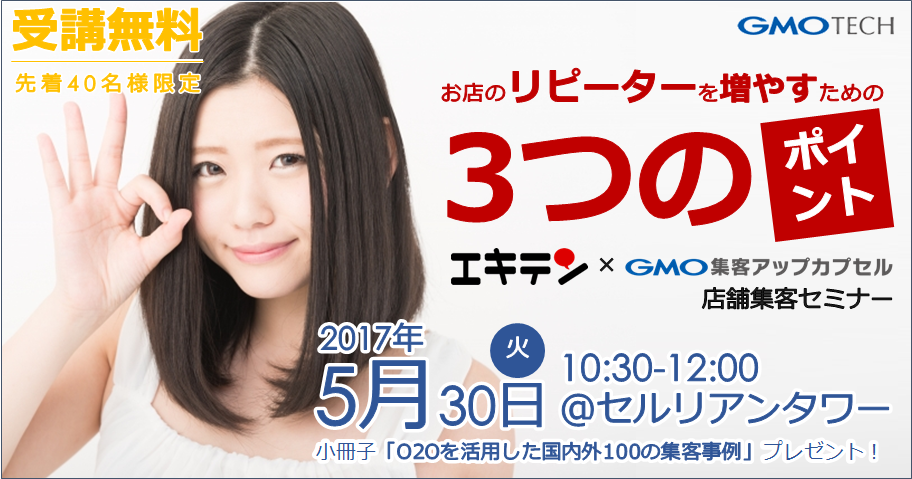 GMOインターネットグループでインターネット上の集客サービスを展開するGMO TECH株式会社(以下、GMO TECH)が運営する「GMO集客アップカプセル」は、株式会社デザインワン・ジャパン(以下、デザインワン・ジャパン)の「エキテン」と共同で、店舗集客の無料セミナー「お店のリピーターを増やすための3つのポイント」を2017年5月30日(火)、セルリアンタワー(東京・渋谷区)で開催いたします。