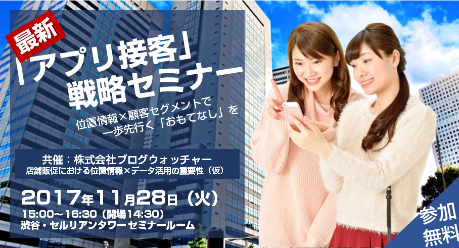 GMOインターネットグループでインターネット上の集客サービスを展開するGMO TECH株式会社(以下、GMO TECH)は、スマートフォンの位置情報データを活用したサービスを開発・提供する株式会社ブログウォッチャー(以下、ブログウォッチャー)と共同で、「最新『アプリ接客』戦略セミナー~位置情報×顧客セグメントで一歩先行く『おもてなし』を!~」を、2017年11月28日(火)にセルリアンタワー(東京・渋谷区)で開催いたします。