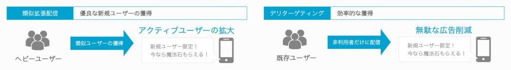 DSPで一般的な、CPC(※6)やCPM(※7)だけでなく、リスクの少ない成果報酬型(CPI・CPA)の広告配信が可能です。精度の高いセグメント配信が可能なため、広告主様のサービス・商品にマッチしたユーザーへ効果的に広告を配信します。例えば、ユーザーの行動履歴データをもとに、高額課金者やヘビーユーザーに類似したユーザーに広告を配信することで、エンゲージメントの高い新規ユーザーの獲得が期待できます。