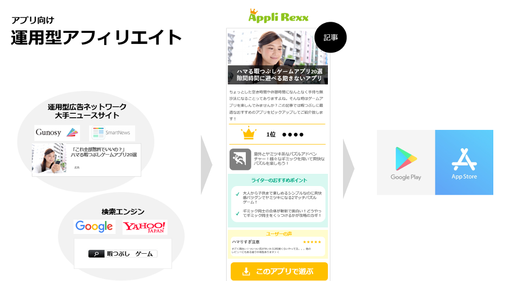 スマートフォンアプリを紹介する「Appli Rexx」には、検索結果や運用型広告を通じて当該アプリに興味を持つユーザーが集まります。ユーザーは、紹介記事を読んでからアプリをインストールするため、記事を経由しないユーザーよりもモチベーションが高く、アプリについての理解も深いことから、アプリをインストールした後も高い継続率も期待できます。
