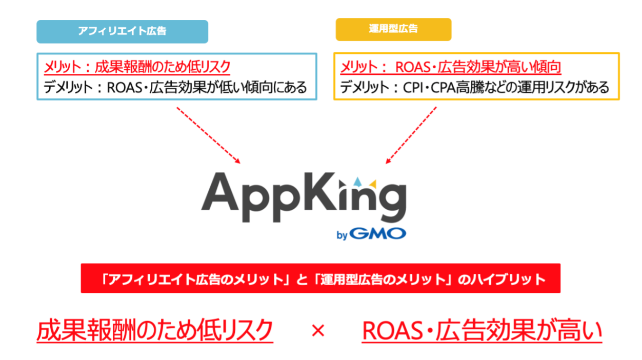 このような中、広告主の皆様から、リスクを減らしながらも広告効果を高めたいという声を多くいただくようになったため、このたび、リスクを抑えやすいアフィリエイト広告と、高い広告効果が見込みやすい運用型広告のハイブリッド型である「AppKing byGMO」をリリースすることといたしました。