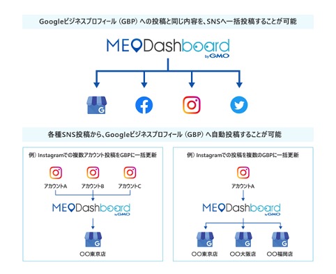 『SNS投稿の連携機能』は、「MEO Dashboard byGMO」にて店舗オーナー様が行うGoogleビジネスプロフィールへの投稿と同時に、各種SNS(Facebook、Instagram、Twitter)に同一内容を投稿できるサービスです。店舗オーナー様は、店舗のSNSアカウントを事前に「MEO Dashboard byGMO」と連携させ、投稿を入力するだけで、選択したSNSに同一内容で同時刻に情報発信することができます。また、この機能を用いて複数のSNSアカウント(例:InstagramアカウントA、InstagramアカウントB 等)での投稿を「MEO Dashboard byGMO」経由でGoogleビジネスプロフィールに入力することも可能です。