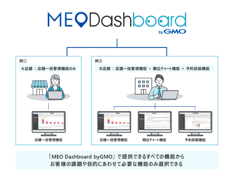 これにより、お客様は自分にあった機能のみを選択しより安価な料金プランで『MEO Dashboard byGMO』をご利用いただけるようになります。(価格は営業担当までお問い合わせください)