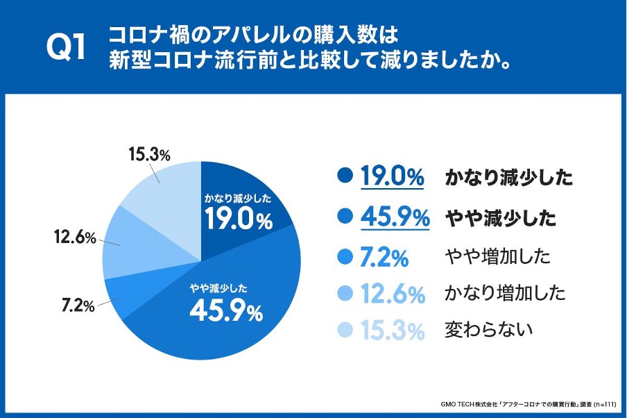 「Q1.コロナ禍のアパレルの購入数は新型コロナ流行前と比較して減りましたか。」(n=111)と質問したところ、「かなり減少した」が19.0%、「やや減少した」が45.9%という回答となりました。