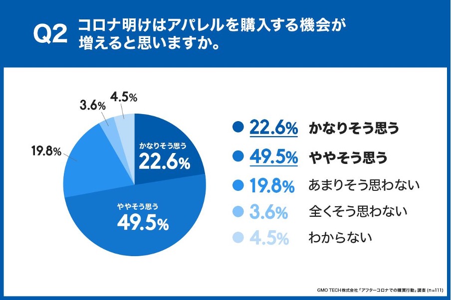 「Q2.コロナ明けはアパレルを購入する機会が増えると思いますか。」(n=111)と質問したところ、「かなりそう思う」が22.6%、「ややそう思う」が49.5%という回答となりました。