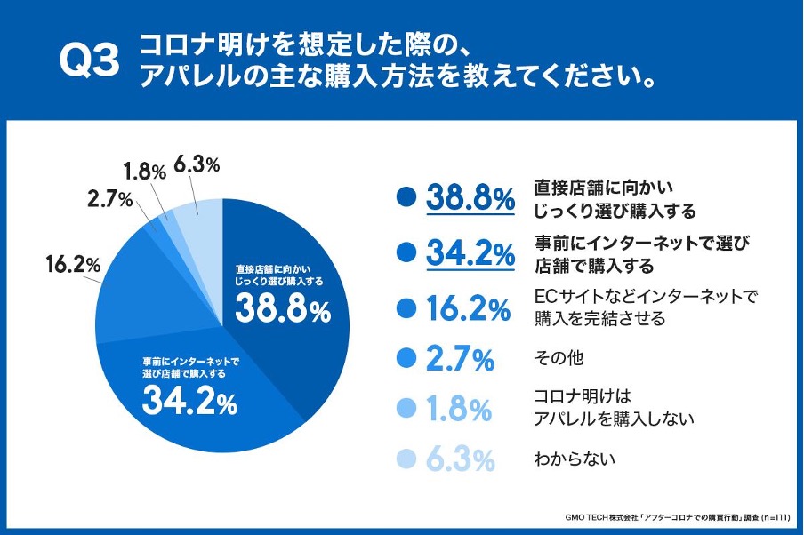「Q3.コロナ明けを想定した際の、アパレルの主な購入方法を教えてください。」(n=111)と質問したところ、「直接店舗に向かいじっくり選び購入する」が38.8%、「事前にインターネットで選び店舗で購入する」が34.2%という回答となりました。