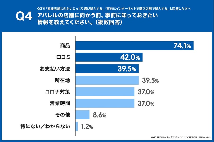 Q3で「直接店舗に向かいじっくり選び購入する」「事前にインターネットで選び店舗で購入する」と回答した方に、「Q4.アパレルの店舗に向かう前、事前に知っておきたい情報を教えてください。(複数回答)」(n=81)と質問したところ、「商品」が74.1%、「口コミ」が42.0%、「お支払い方法」が39.5%という回答となりました。