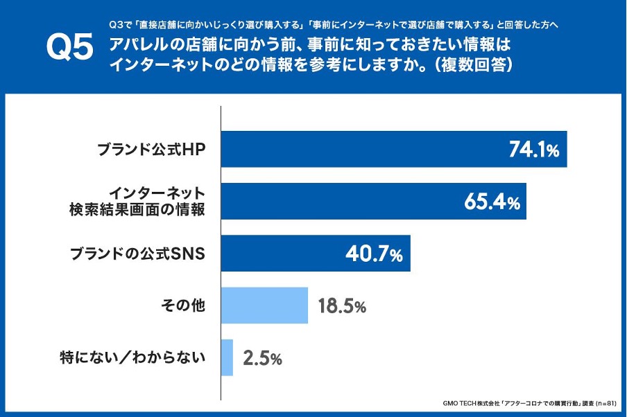 Q3で「直接店舗に向かいじっくり選び購入する」「事前にインターネットで選び店舗で購入する」と回答した方に、「Q5.アパレルの店舗に向かう前、事前に知っておきたい情報はインターネットのどの情報を参考にしますか。(複数回答)」(n=81)と質問したところ、「ブランド公式HP」が74.1%、「インターネット検索結果画面の情報」が65.4%、「ブランドの公式SNS」が40.7%という回答となりました。
