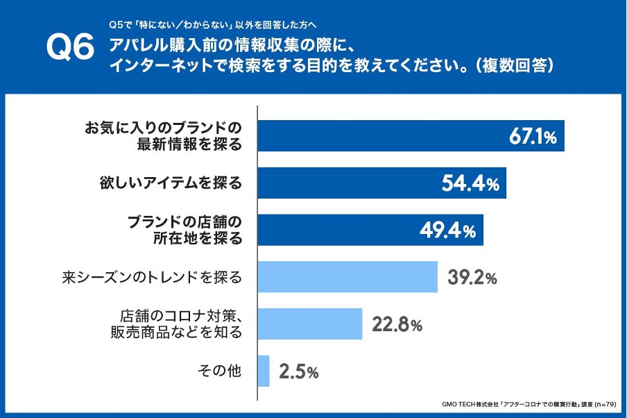 Q5で「特にない/わからない」以外を回答した方に、「Q6.アパレル購入前の情報収集の際に、インターネットで検索をする目的を教えてください。(複数回答)」(n=79)と質問したところ、「お気に入りのブランドの最新情報を探る」が67.1%、「欲しいアイテムを探る」が54.4%、「ブランドの店舗の所在地を探る」が49.4%という回答となりました。