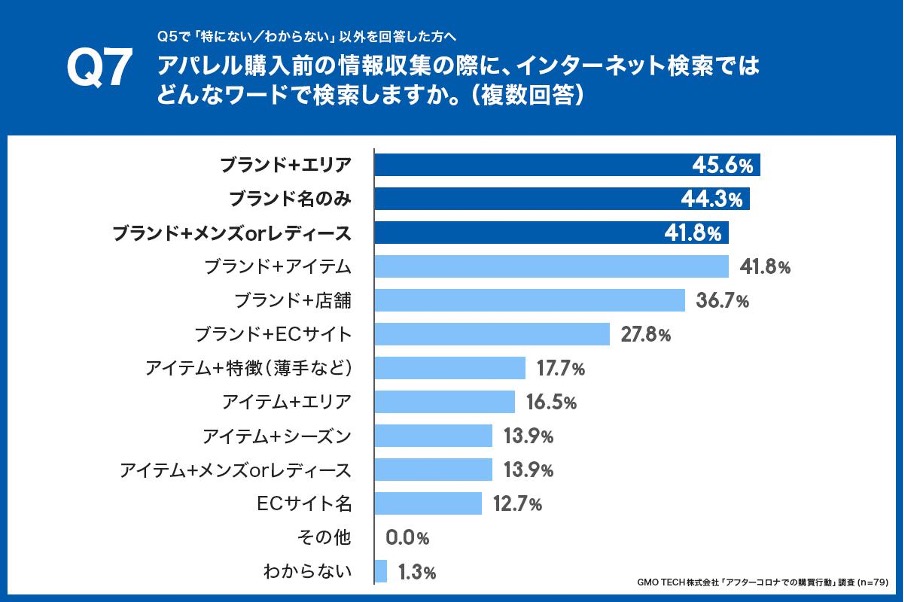 Q5で「特にない/わからない」以外を回答した方に、「Q7.アパレル購入前の情報収集の際に、インターネット検索ではどんなワードで検索しますか。(複数回答)」(n=79)と質問したところ、「ブランド+エリア」が45.6%、「ブランド名のみ」が44.3%、「ブランド+メンズorレディース」が41.8%という回答となりました。