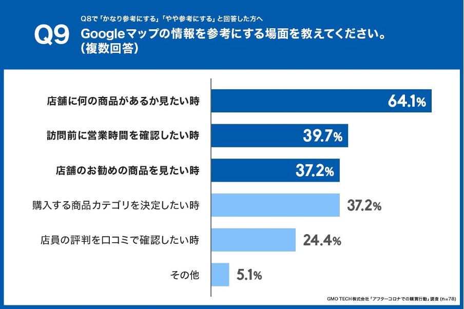 Q8で「かなり参考にする」「やや参考にする」と回答した方に、「Q9.Googleマップの情報を参考にする場面を教えてください。(複数回答)」(n=78)と質問したところ、「店舗に何の商品があるか見たい時」が64.1%、「訪問前に営業時間を確認したい時」が39.7%、「店舗のお勧めの商品を見たい時」が37.2%という回答となりました。