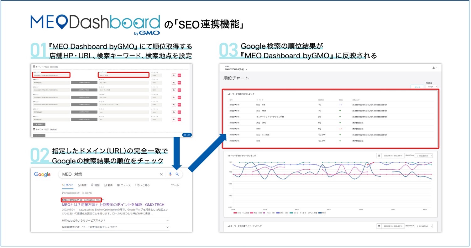 GMOインターネットグループでインターネット上の集客サービスを展開するGMO TECH株式会社(代表取締役社長CEO:鈴木 明人 以下、GMO TECH)は、MEO(※1)総合管理ツール『MEO Dashboard byGMO』において、Googleビジネスプロフィール(以下、GBP)上で表示される店舗のWEBサイト・URLの店舗ホームページと、指定検索エリア及び指定キーワードを順位表示できる「SEO連携機能」を10月31日より実装します。