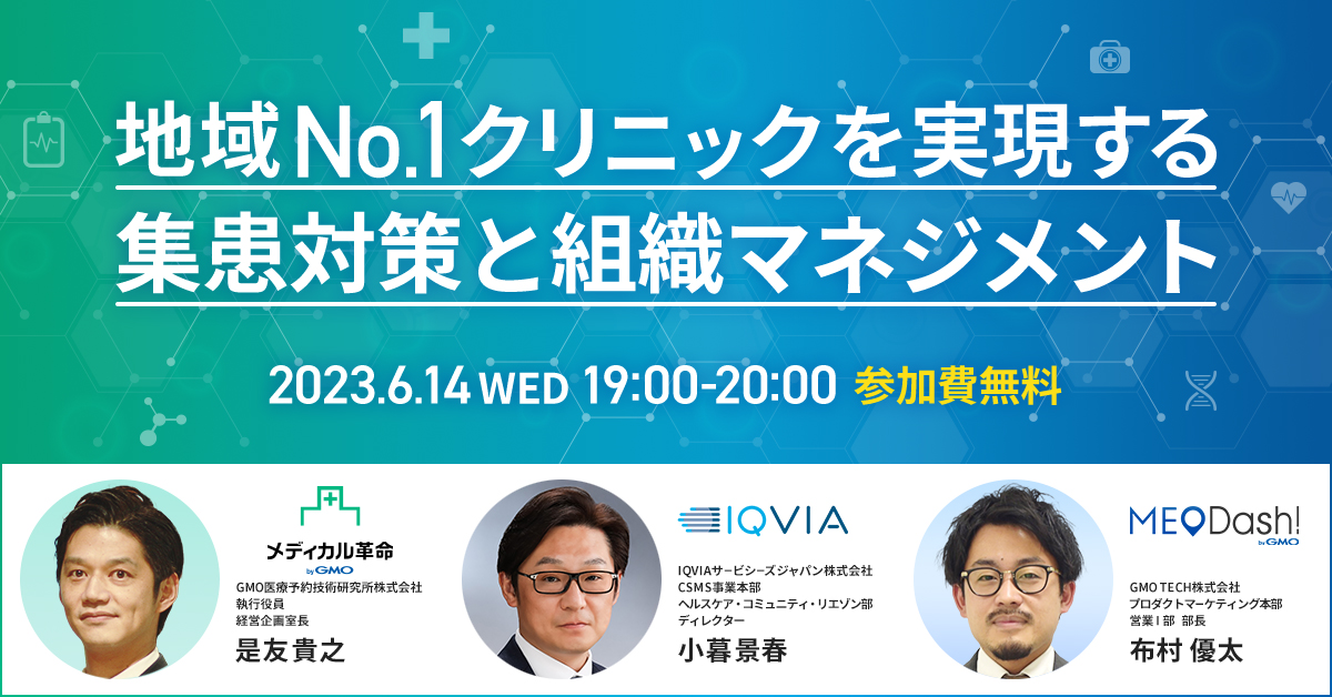 GMOインターネットグループでインターネット上の集客サービスを展開するGMO TECH株式会社(代表取締役社長CEO:鈴木 明人 以下、GMO TECH)は医科診療所の経営をサポートするIQVIAサービスジャパン株式会社(以下、IQVIA)と、予約管理の効率化や経営改善を実現するGMO医療予約技術研究所株式会社(以下、医技研)と共催し、6月14日(水)19時より、「地域No.1クリニックを実現する集患対策と組織マネジメント」と題したウェビナーを共催いたします。