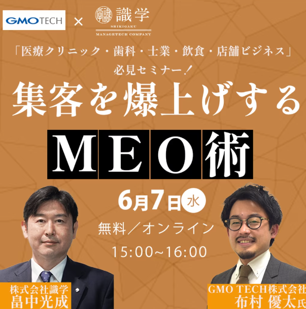 GMOインターネットグループでインターネット上の集客サービスを展開するGMO TECH株式会社(代表取締役社長CEO:鈴木 明人 以下、GMO TECH)は経営コンサルティングサービスを提供する株式会社識学(以下、識学)と、6月7日(水)15時より、「医療クリニック・歯科・士業・飲食・店舗ビジネス必見セミナー!集客を爆上げするMEO術」と題したウェビナーを開催いたします。