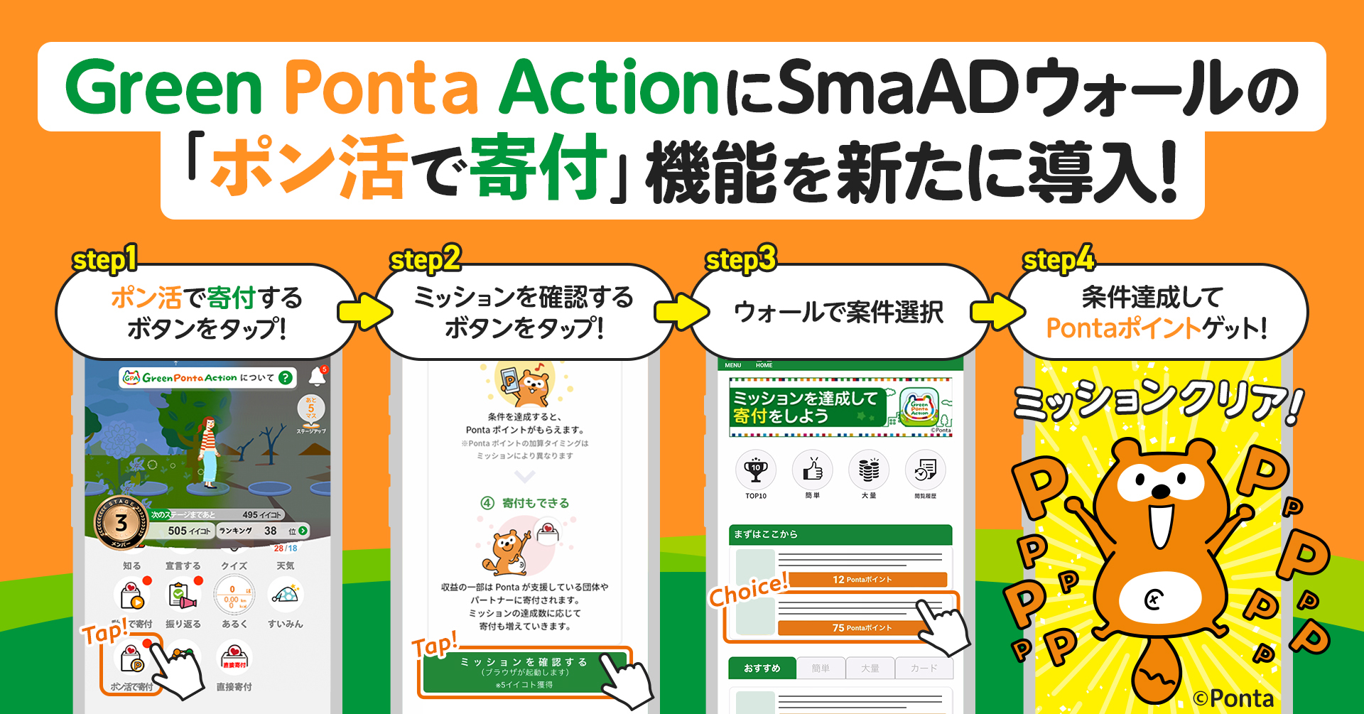 GMOインターネットグループでインターネット上の集客サービスを展開するGMO TECH株式会社(代表取締役社長CEO:鈴木 明人 以下、GMO TECH)は、株式会社ロイヤリティ マーケティングが提供する、SDGsアプリ「Green Ponta Action」において、GMO TECHが提供する専用広告掲載ページの『SmaADウォール』(オファーウォール)(※1) の『ポン活で寄付』機能を新たに提供しました。