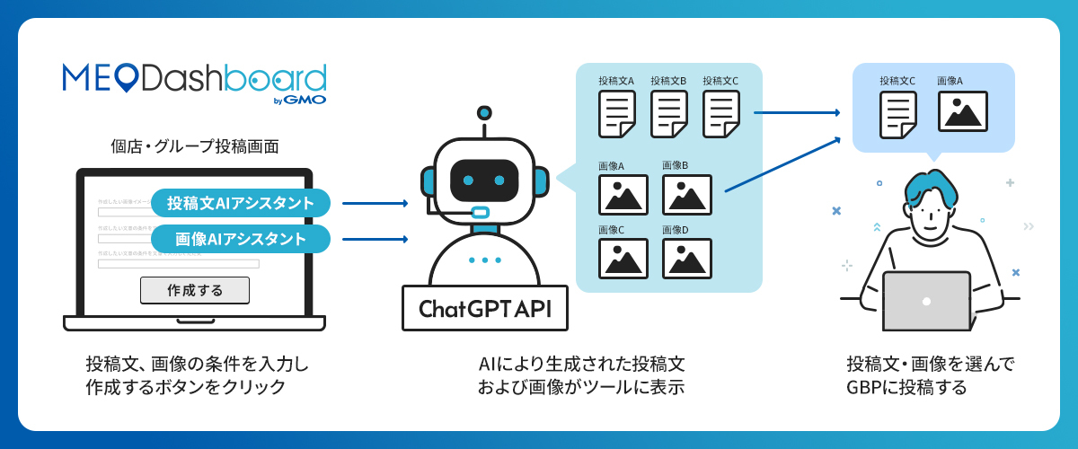『AI投稿アシスタント機能 Powered by ChatGPT API』は、Googleマップ上で店舗ページの検索順位を上げる施策を管理するサービス「MEO Dashboard byGMO」で管理する個店・複数店のGBP投稿をよりスピーディに投稿するための機能です。投稿内にある投稿文章および投稿画像に関する条件を指定し、ワンクリックでAIが判定した投稿文章と投稿画像が自動生成されます。