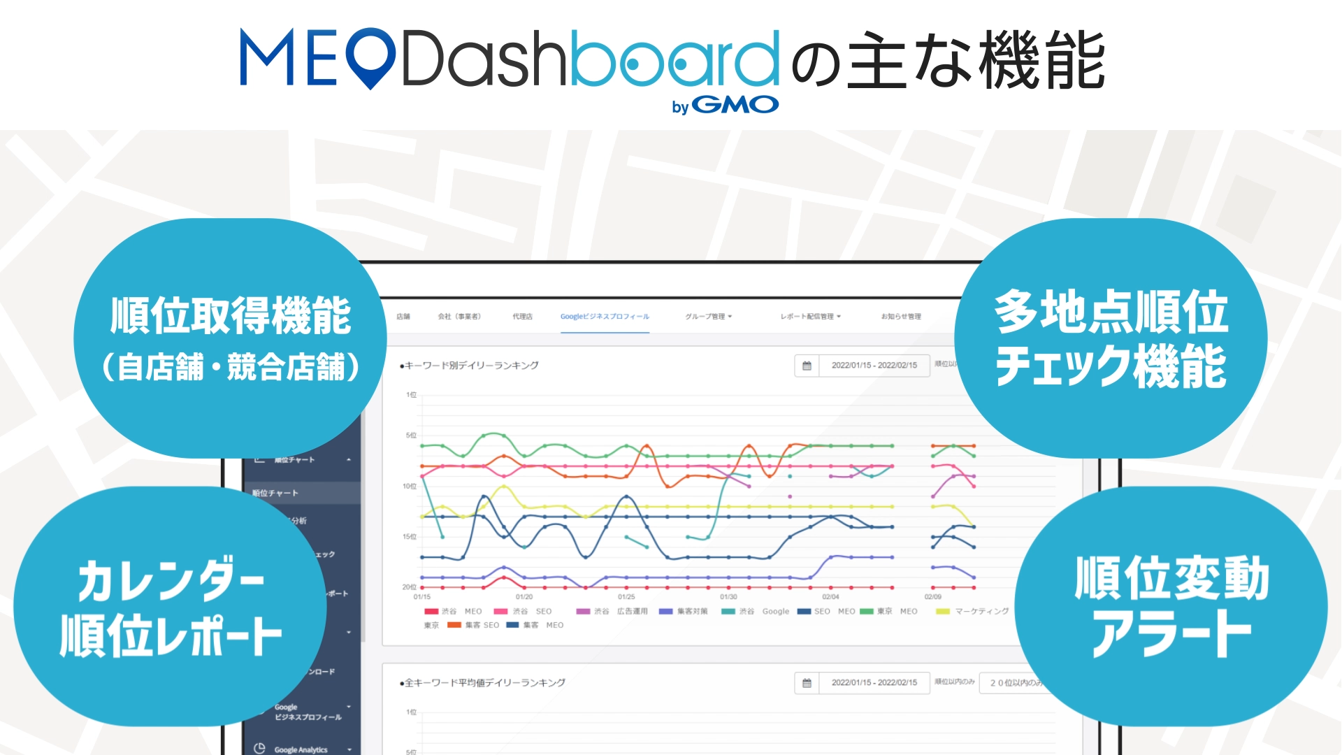 GMO TECHのローカルSEO施策サービス「MEO Dash! byGMO」が搭載する『MEO Dashboard byGMO』は、GBP運用に必要なあらゆる機能を搭載したMEO順位計測管理ツールです。