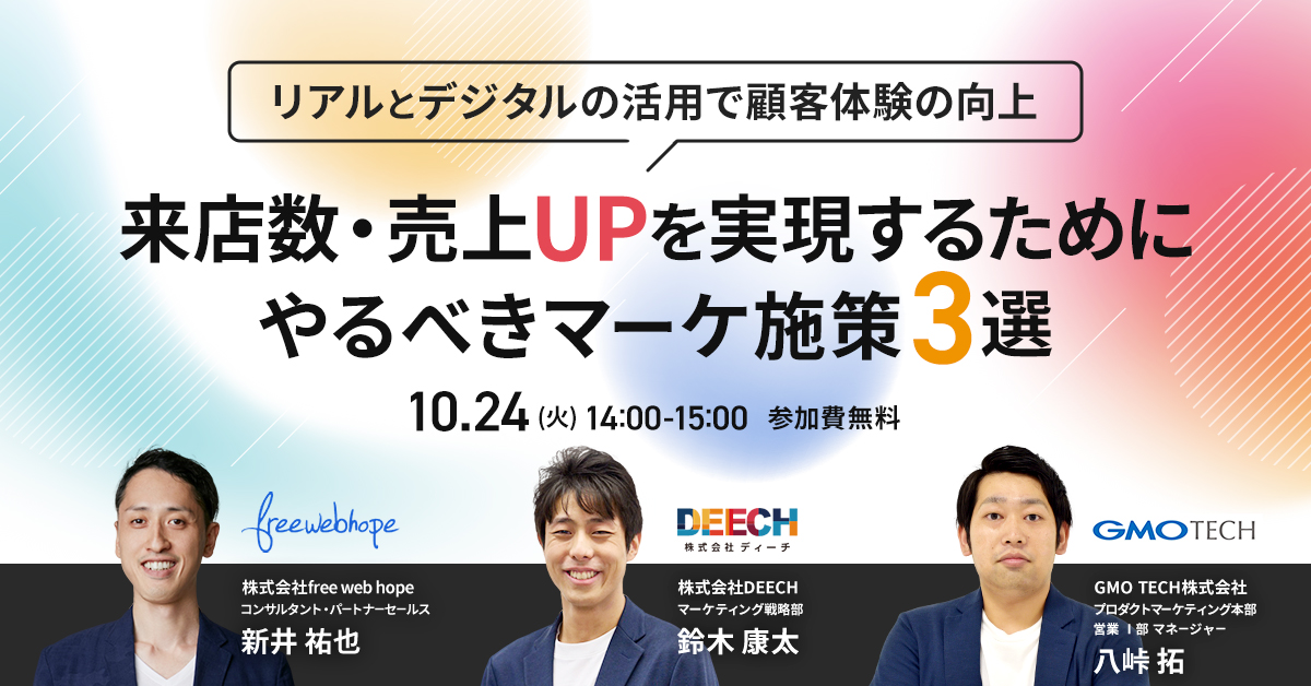 GMOインターネットグループでインターネット上の集客サービスを展開するGMO TECH株式会社(代表取締役社長CEO:鈴木 明人 以下、GMO TECH)はLP制作・LPOサービスを提供する株式会社free web hope(以下、free web hope)と、エリアマーケティングシステムを提供する株式会社DEECH(以下、DEECH)と共催し、10月24日(火)14時より、「リアルとデジタルの活用で顧客体験の向上 来店数・売上UPを実現するためにやるべきマーケ施策3選」と題したウェビナーを開催いたします。