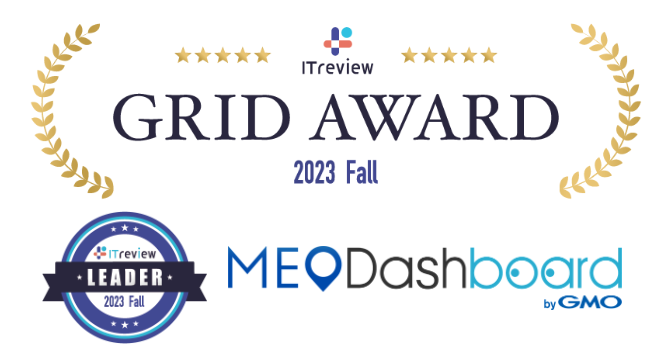 GMOインターネットグループでインターネット上の集客サービスを展開するGMO TECH株式会社(代表取締役社長CEO:鈴木 明人 以下、GMO TECH)が提供するMEO(※1)総合管理ツール『MEO Dashboard byGMO』は、製品レビュー(口コミ)をもとに選定され顧客満足度の高い製品を表彰する「ITreview Grid Award 2023 Fall」(主催:アイティクラウド株式会社 URL:https://www.itreview.jp/award/2023_fall.html)において、以下2部門で最高位となる『Leader』賞を受賞しましたのでお知らせいたします。