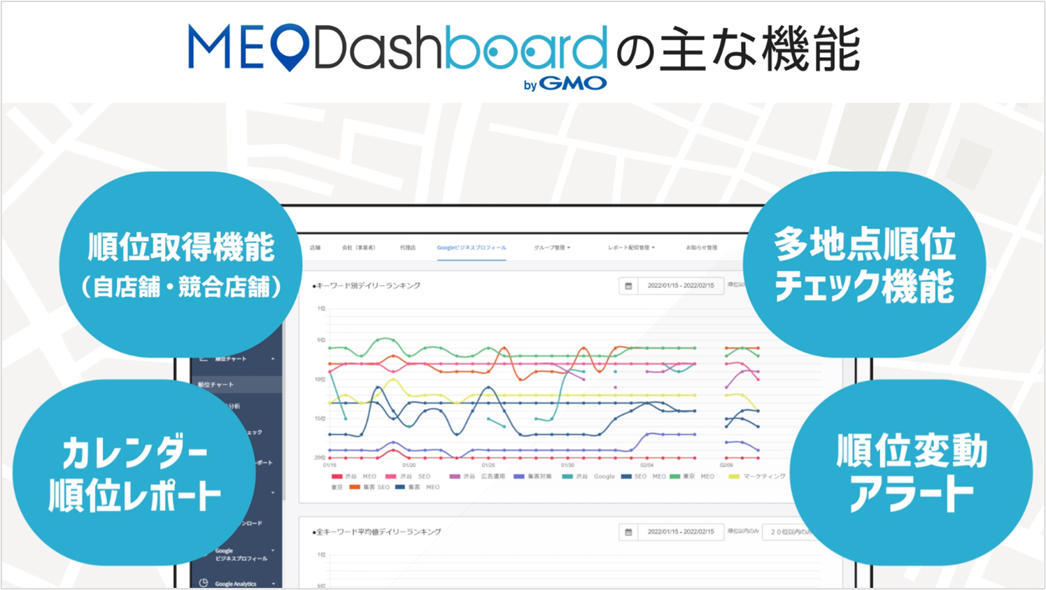 GMO TECHのローカルSEO施策サービス「MEO Dash! byGMO」が搭載する『MEO Dashboard byGMO』は、GBP運用に必要なあらゆる機能を搭載したMEO順位計測管理ツールです。