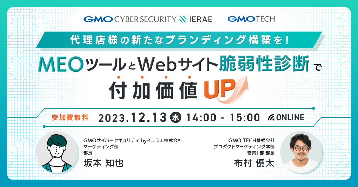 GMOインターネットグループでインターネット上の集客サービスを展開するGMO TECH株式会社(代表取締役社長CEO:鈴木 明人 以下、GMO TECH)はサイバーセキュリティ診断サービスを提供するGMOサイバーセキュリティ byイエラエ株式会社(以下、イエラエ)と共催し、12月13日(水)14時より、「MEOツールとWebサイトの脆弱性診断で付加価値UP 代理店様の新たなブランディング構築を」と題したウェビナーを開催いたします。