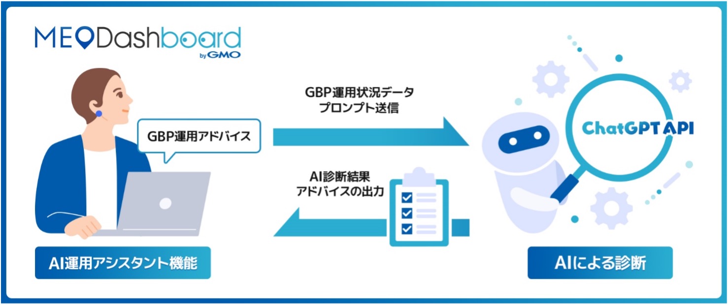 【『AI運用アシスタント機能』の概要】『AI運用アシスタント機能』は、『MEO Dashboard byGMO』にて登録されているGBPの「店舗の基本情報」「イベントや最新のお知らせなどの投稿」「写真投稿」「クチコミ返信」などを、AIを用いて分析・評価します。そして、この評価をもとに、GBP運用を改善するアドバイスを即時で提供いたします。