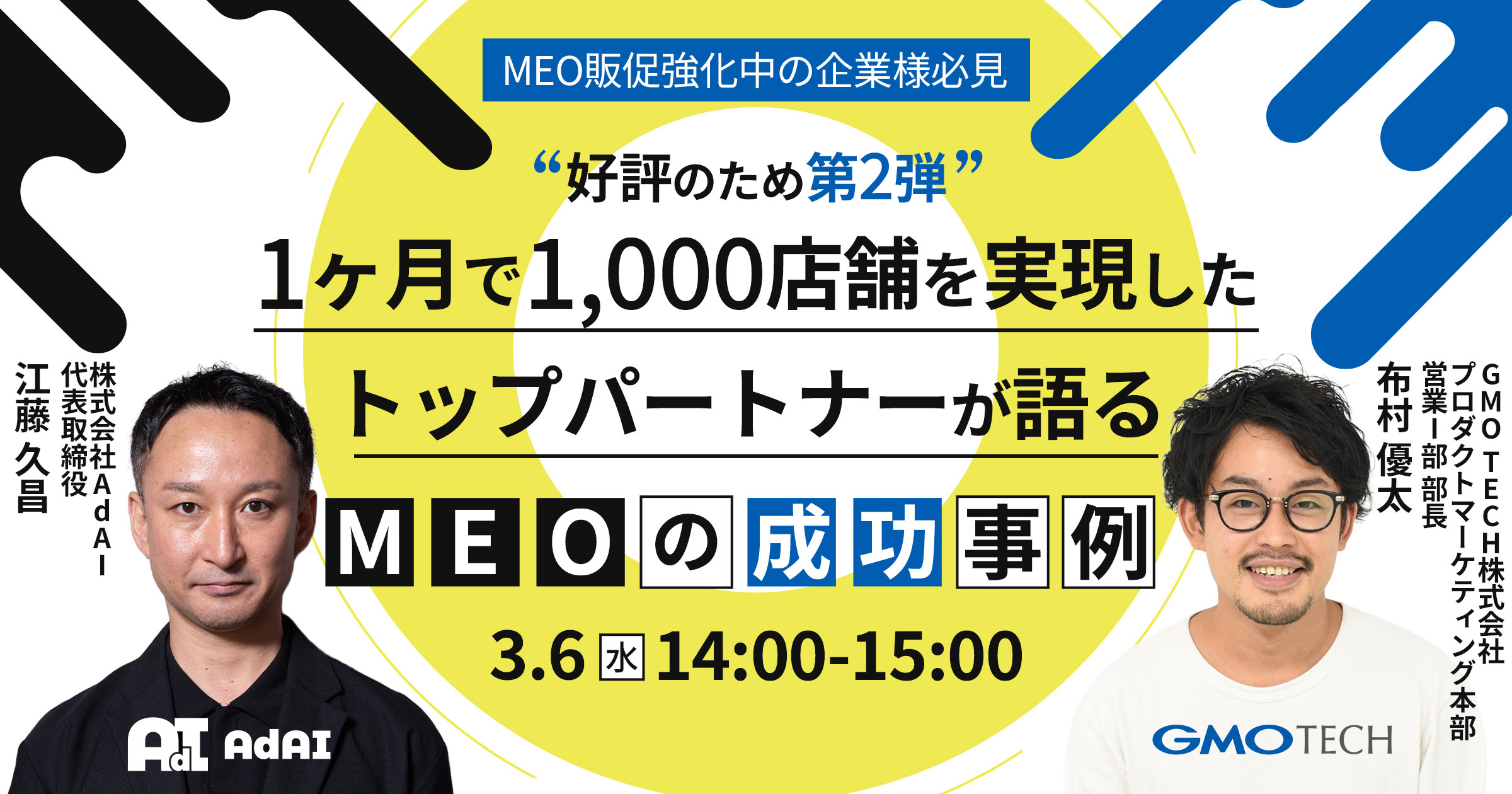 GMOインターネットグループでインターネット上の集客サービスを展開するGMO TECH株式会社(代表取締役社長CEO:鈴木 明人 以下、GMO TECH)はAI事業やウェビナー事業、インターネット広告事業を提供する株式会社AdAI(以下、AdAI)と共催し、3月6日(水)14時より、「【好評のため第2弾】1ヶ月で1,000店舗を実現したロップパートナーが語るMEOの成功事例」と題したウェビナーを開催いたします。
